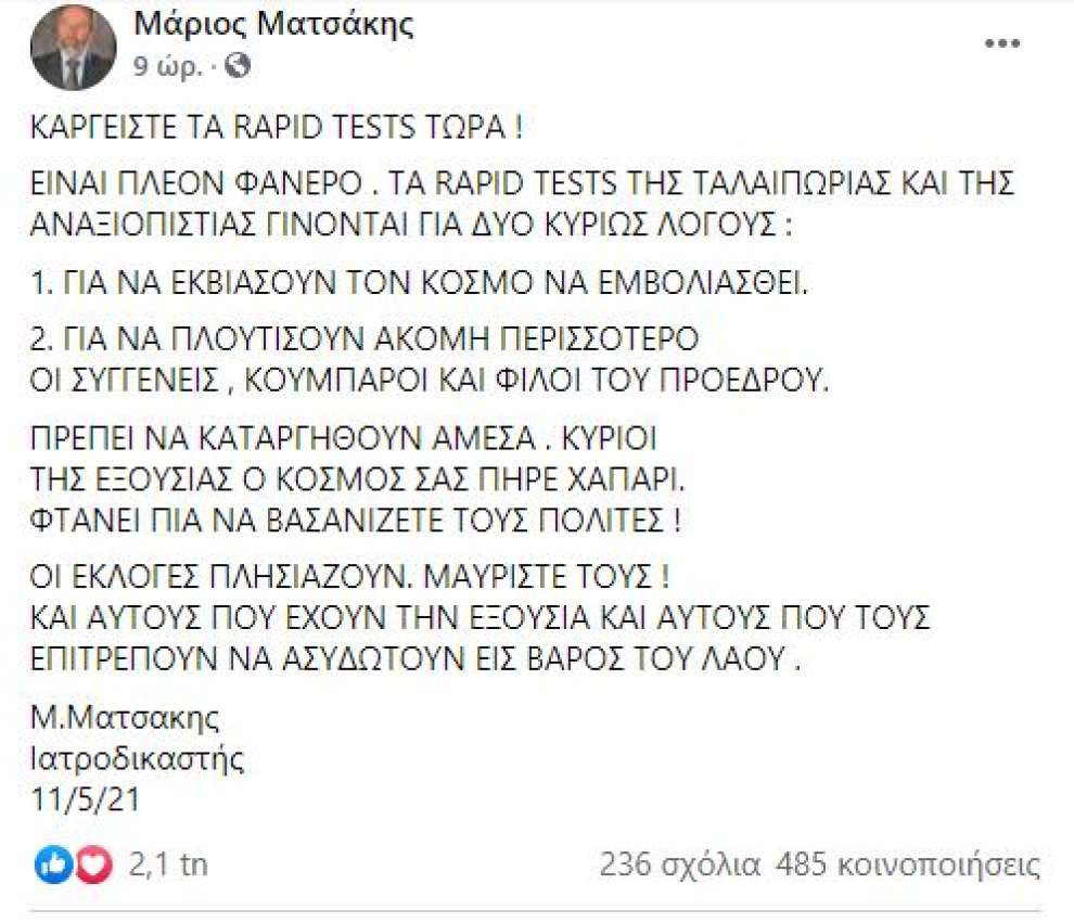 Σε ανάρτησή του στον προσωπικό του λογαριασμό στο facebook, ο ιατροδικαστής και πρώην ευρωβουλευτής, Μάριος Ματσάκης, ζητά την κατάργηση των rapid test, αφού όπως αναφέρει, είναι αναξιόπιστα και γίνονται για να εκβιάσουν τον κόσμο να εμβολιαστεί και για να πλουτίσουν κάποιοι.